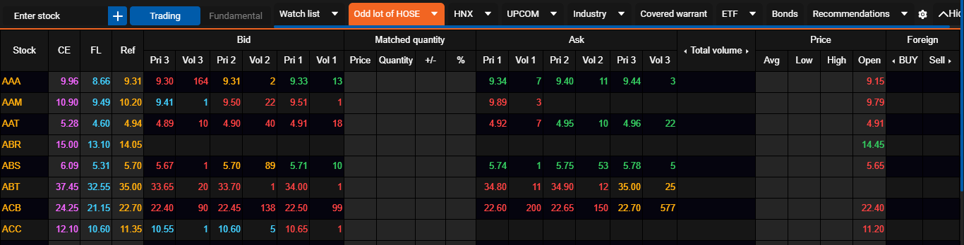 To view the price board of odd lots of Stock exchange, please point your mouse into the menu of each Stock exchange and go to the Odd Lot section [Stock exchange name]