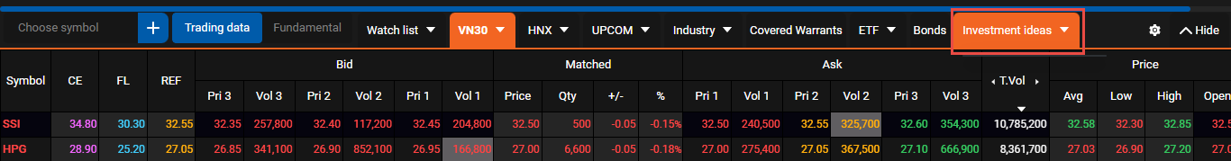 - To view the securities in the list “Investment ideas”, please click on the online price board menu and click Investment ideas