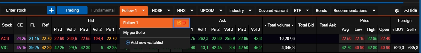 - To edit the Watchlist name, simply point your mouse over ” Watchlist “, select the “Edit” icon to the right of the category name to be edited. To delete a Watchlist, select the “Delete” icon to the right of the category to be deleted.