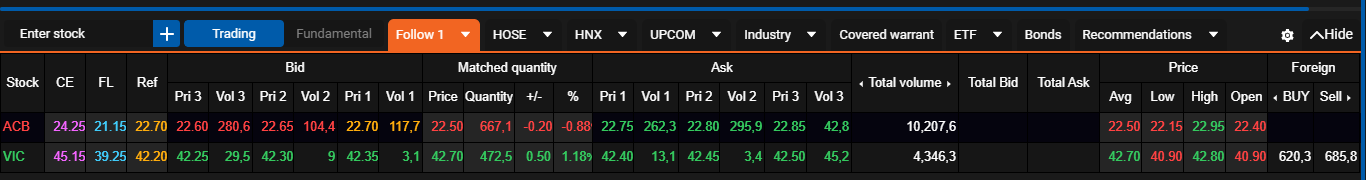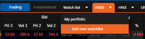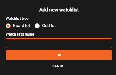 - After entering the name, click “OK” to confirm and proceed to create the Watchlist, after successfully creating a new watchlist, system will automatically switch to the newly created Watchlist, where you proceed to add stock to the Watchlist by selecting the box “Enter stock”, then enter any stock code and press “Enter” to add to the current Watchlist.