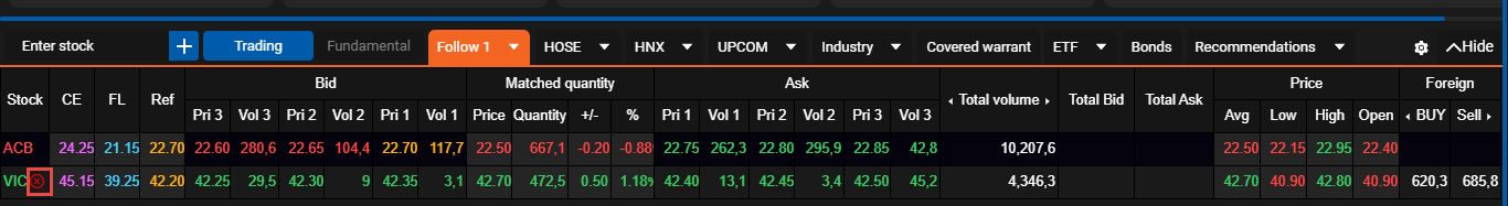 - To delete a stock code in the Watchlist, simply point your mouse over the stock code’s name to be deleted and select the delete icon