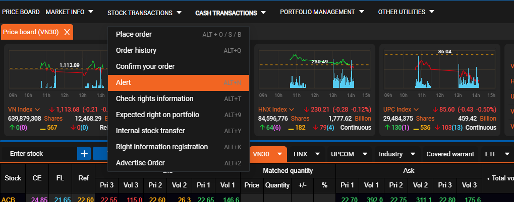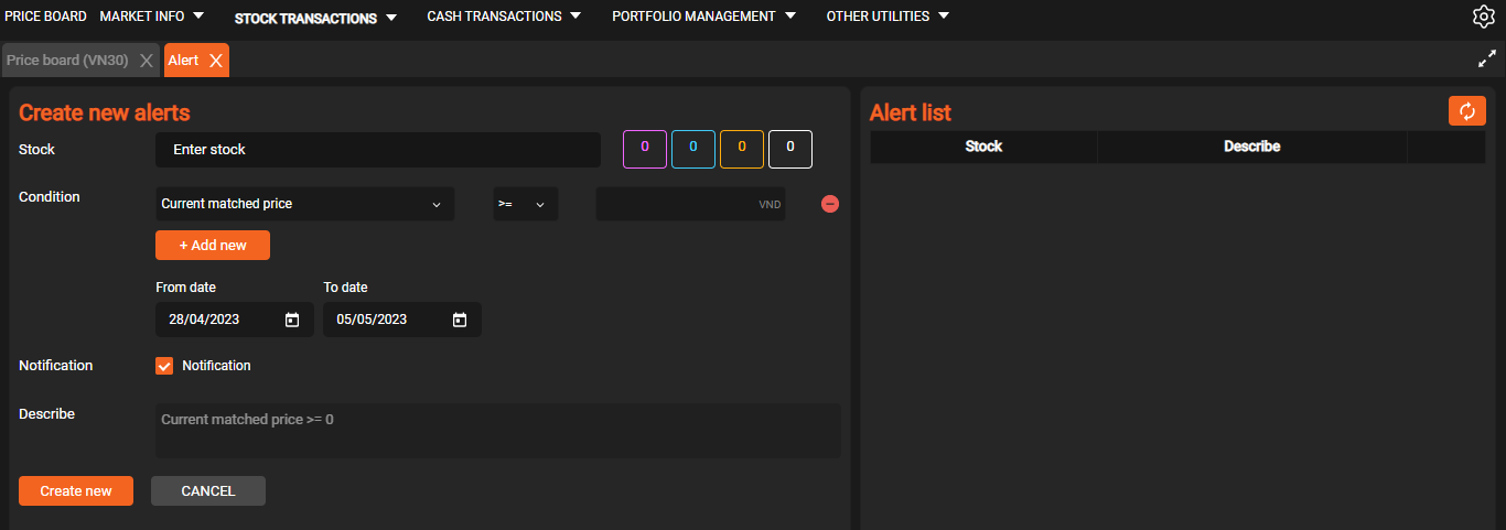 - To access the “Alerts” screen, point over the “Stock transactions” section, then select “Alert”