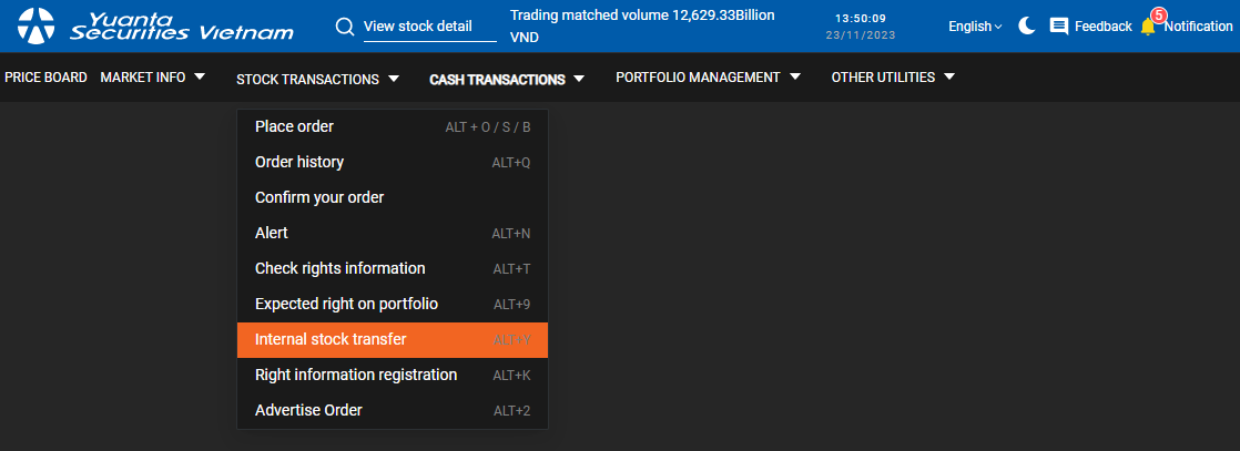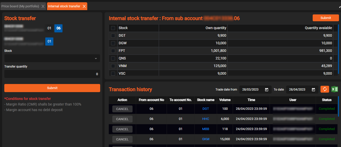 - The system will then display the “Internal stock transfer” screen for you to make securities transfers between sub-accounts