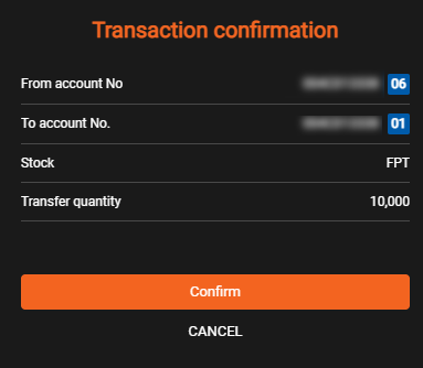- Click “Confirm” to confirm the stock transfer, select “Cancel” to cancel the operation and close the notification. If you have not entered the OTP at the login screen, the system will now ask you to enter the OTP code to confirm the transaction and confirm again for the system to proceed with the securities transfer.