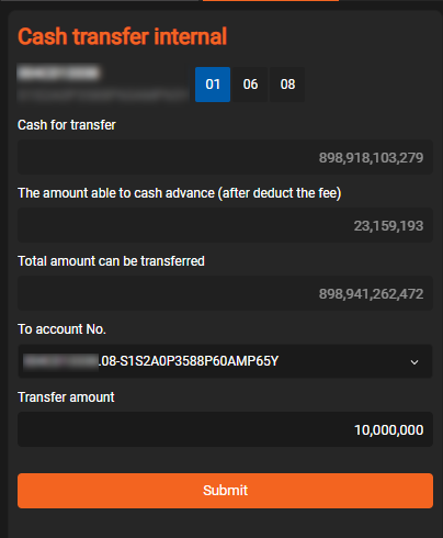 - At the “Internal Transfer” screen, you can transfer money from one sub-account to another by clicking on the sub-account to be transferred, the receiving sub-account and entering the amount to be transferred, then click “Submit “