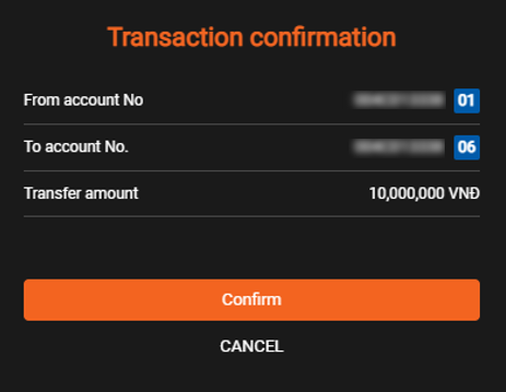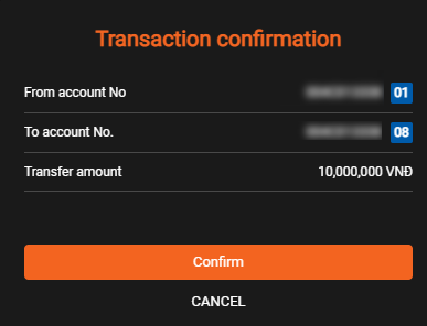 - At the transfer confirmation screen, please check the information and click “Confirm” to complete the transaction or select “Cancel” to stop the operation and close the notification. In case you have not entered OTP at the login screen, the system will ask you to enter OTP code to confirm the transaction.