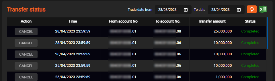 - After completing the transaction, you can look up information of internal transfers by a specific time period by clicking on the search period right on the list of results at the “Transfer status” screen