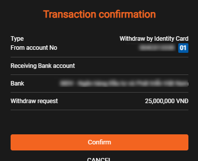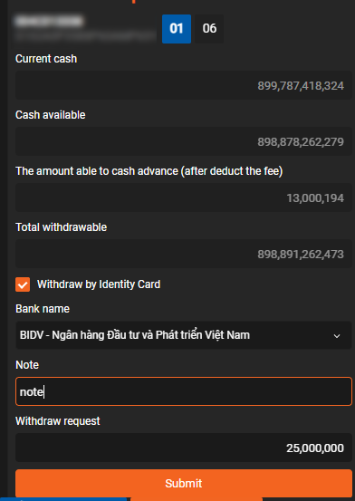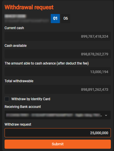 - Similar to the withdrawal request to the linked bank account, with a withdrawal request by ID card, you will check the field “Withdraw by Identity Card” and enter all information of the receiving bank, the amount to withdraw and press the “Submit” button