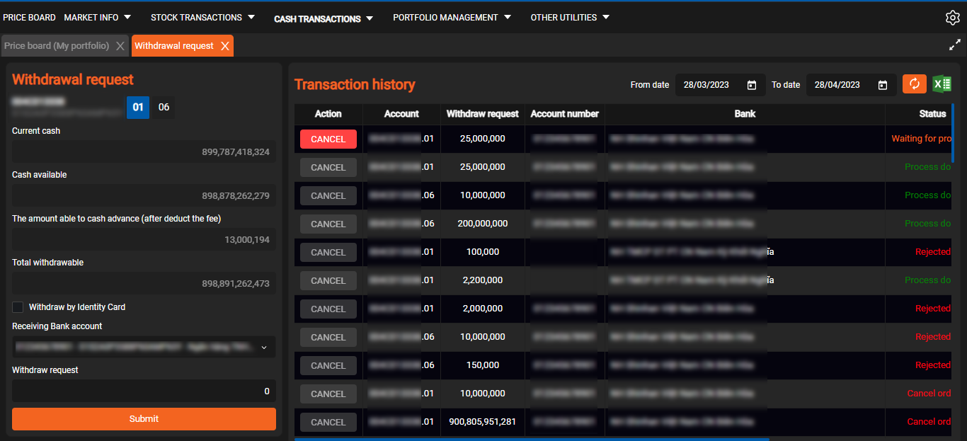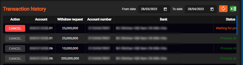 - At the same time in the transaction history list, you can also cancel the Withdrawal request for requests that are in the “Pending approval” status. To cancel a request, simply click the “Cancel” button at that request line