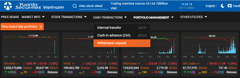- To access the “Request withdrawal” screen, you need to point over “Cash transactions” in the main menu bar and click “Request withdrawal”