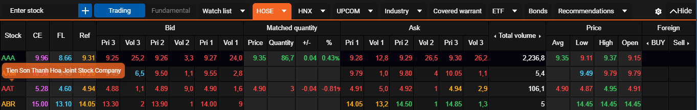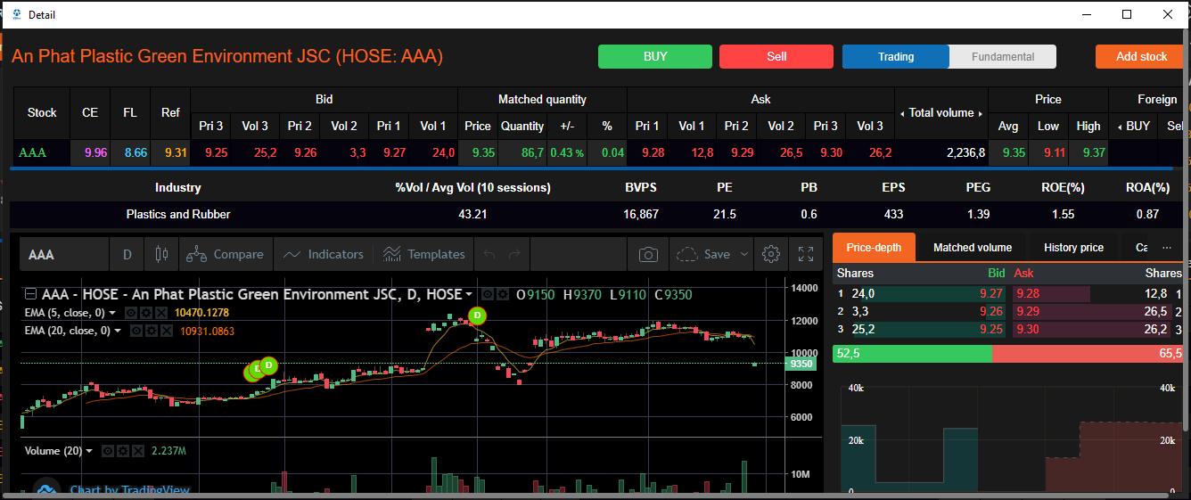 - The system will display a window including the detailed information of the stock code. To place a “Buy/Sell” order for the stock symbol you are viewing in detail, you just need to click on the “Buy” or “Sell” button above, the system will automatically open the order screen for you