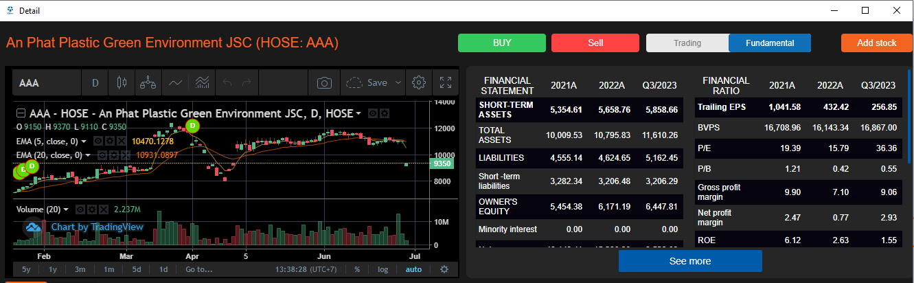 - To view stock details in Fundamental form, you need to click on the “Fundamental ” button, the window will automatically load information related to the Fundamental section and display to you