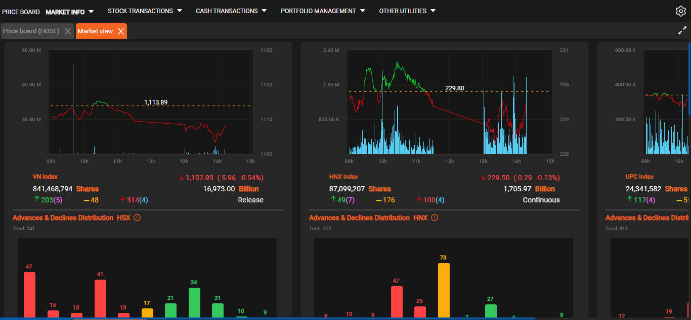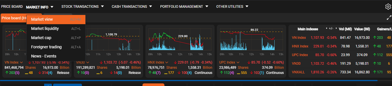 - To enter the “Market view” screen, users need to point the mouse to the “Market infor” item on the main menu and select “Market view”