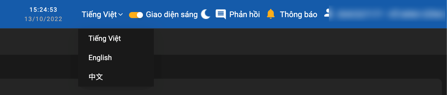 Để đổi ngôn ngữ cho hệ thống giao dịch, quý khách nhấn chọn vào mục “Ngôn ngữ” phía trên cùng của hệ thống