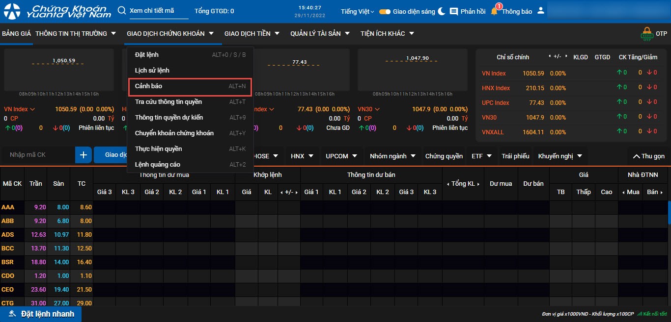 - Để truy cập màn hình “Cảnh báo”, quý khách rê chuột vào mục “Giao dịch chứng khoán”, sau đó chọn “Cảnh báo”