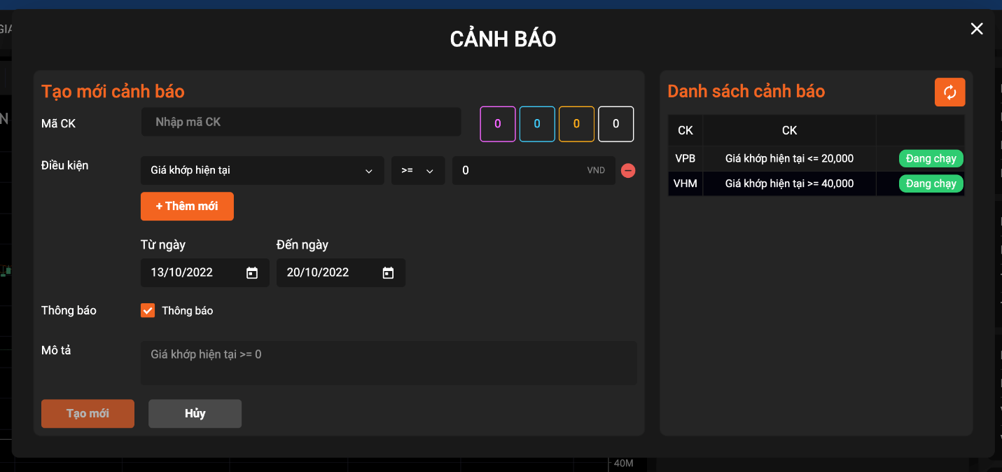 - Sau đó hệ thống sẽ hiển thị cho quý khách màn hình “Cảnh báo” để quý khách thiết lập cảnh báo cho mã chứng khoán, tra cứu thông tin cảnh báo trước đó hoặc cập nhật trạng thái một cảnh báo đã có