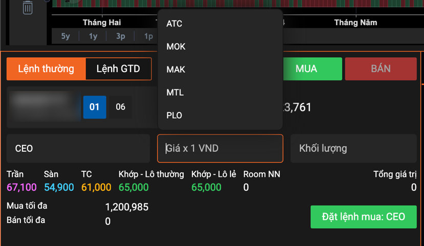- Quý khách có thể chọn giá và nhập khối lượng cần mua/bán của chứng khoán