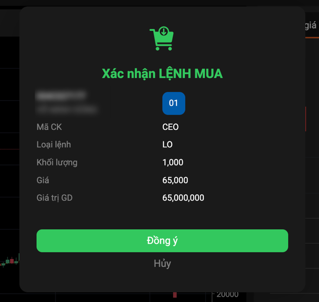- Sau khi đã chọn/nhập giá muốn mua/bán, nhập đầy đủ thông tin cần thiết để mua/bán, quý khách tiến hành đặt lệnh bằng cách nhấn vào nút “Đặt lệnh mua” hoặc “Đặt lệnh bán”, hệ thống sẽ hiển thị một thông báo xác nhận lệnh, quý khách nhấn chọn “Đồng ý” để tiến hành đặt lệnh và qua bước tiếp theo hoặc chọn “Hủy” để đóng thông báo và hủy thao tác
