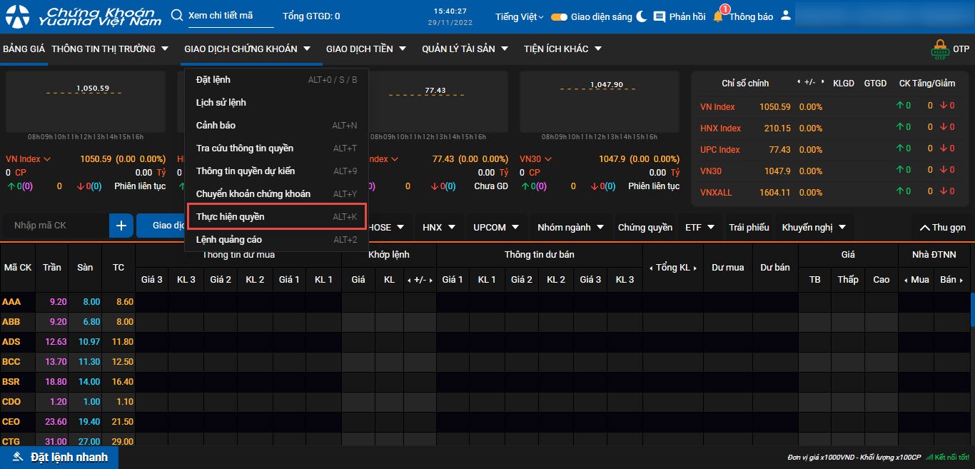 - Để truy cập màn hình “Thực hiện quyền”, quý khách rê chuột vào mục “Giao dịch chứng khoán”, sau đó chọn “Thực hiện quyền”