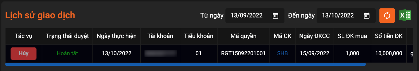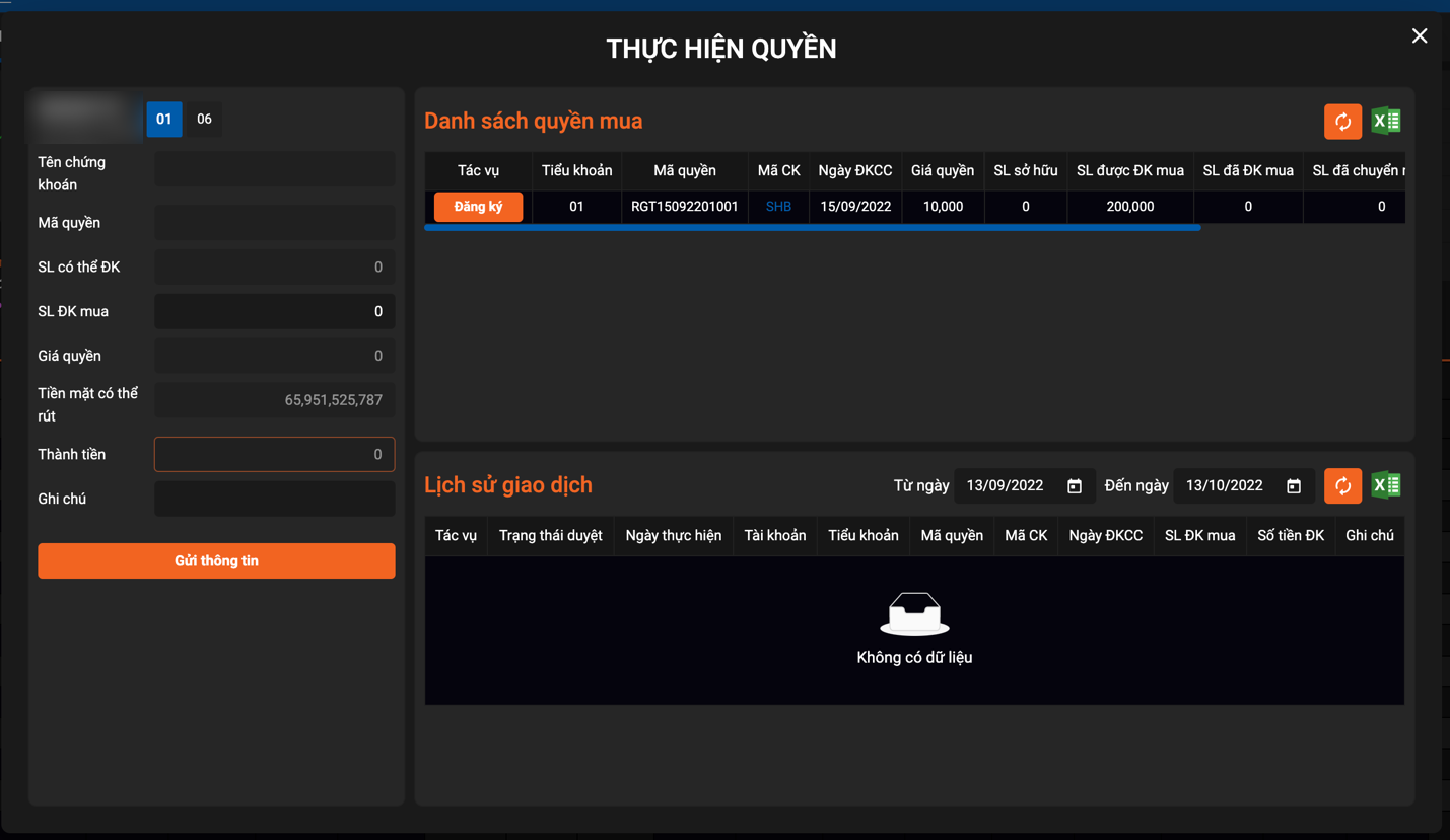 - Sau khi đăng ký mua thành công, hệ thống sẽ cập nhật dữ liệu dưới màn hình “Lịch sử giao dịch”