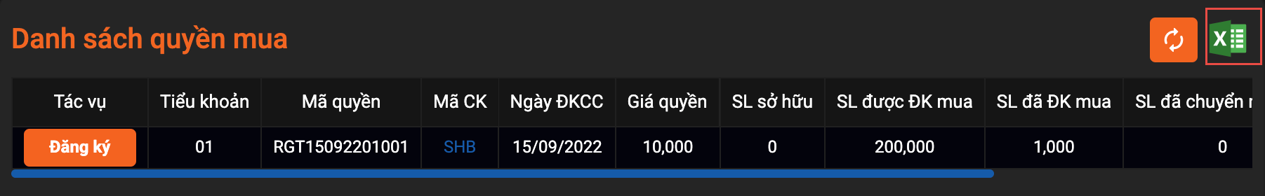 - Đồng thời tại danh sách quyền mua, quý khách có thể trích xuất dữ liệu ra file excel bằng cách nhấn chọn vào nút “Trích xuất dữ liệu”