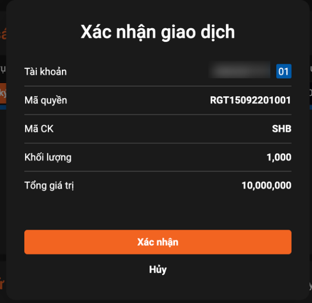 - Nhấn chọn “Xác nhận” để xác nhận mua chứng khoán, chọn “Hủy” để hủy yêu cầu và đóng thông báo.