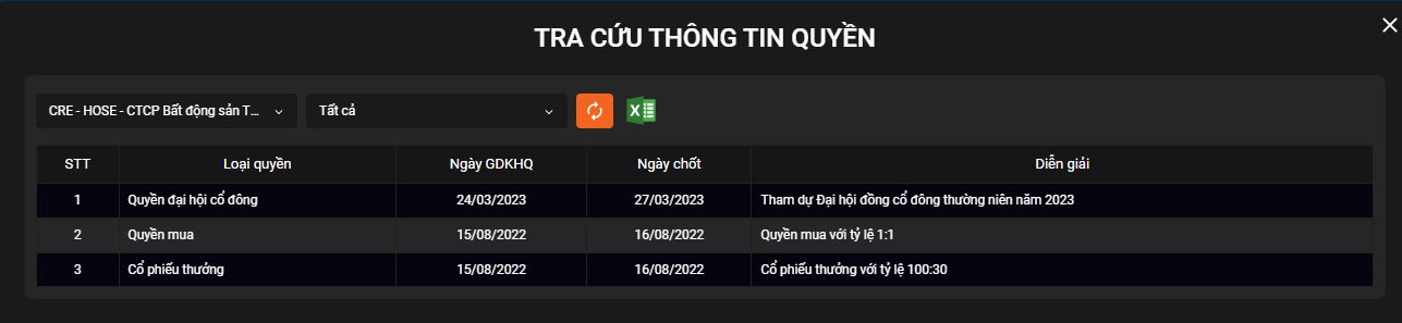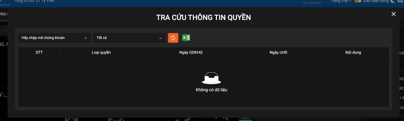 - Tại đây, quý khách tiến hành nhập mã chứng khoán cần tra cứu tại ô “Hãy nhập mã chứng khoán” và chọn loại quyền cần tra cứu