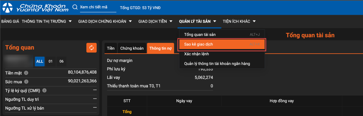 - Để truy cập màn hình “Sao kê giao dịch”, quý khách chỉ cần rê chuột vào mục “Quản lý tài sản” tại menu chính và nhấn chọn mục “Sao kê giao dịch”