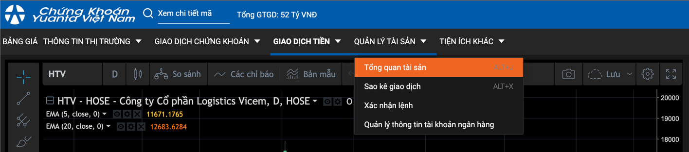 - Để truy cập màn hình “Tổng quan tài sản”, quý khách chỉ cần rê chuột vào mục “Quản lý tài sản” tại menu chính và nhấn chọn mục “Tổng quan tài sản”