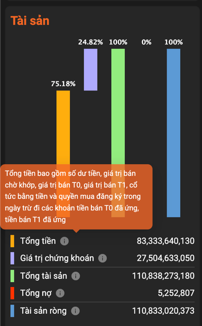 - Quý khách cũng có thể xem chi tiết “Tổng tài sản tiền”, “Tổng tài sản chứng khoán”,… bằng cách rê chuột vào mục (i) ngay bên cạnh, hệ thống sẽ hiển thị chi tiết từng loại tài sản….