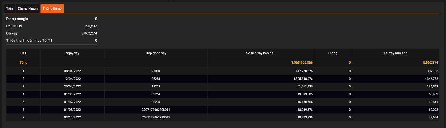 - Khi chọn tiểu khoản ký quỹ hệ thống sẽ hiển thị thêm Tab “Tình trạng tài khoản” hiển thị các thông tin về tình trạng của tài khoản đó cho quý khách.