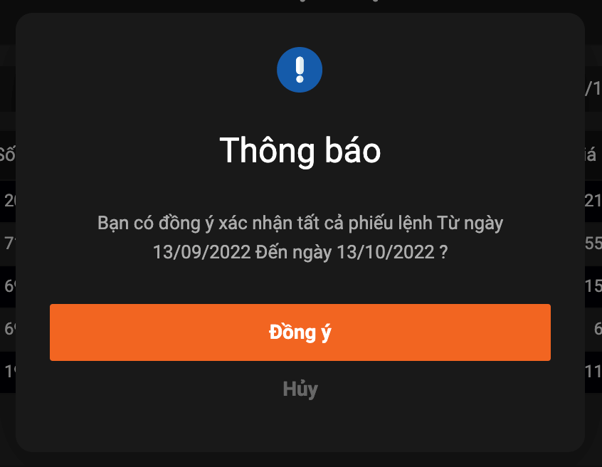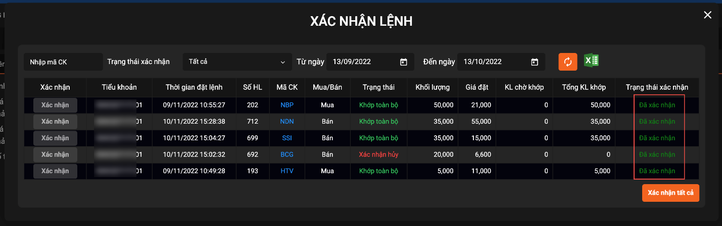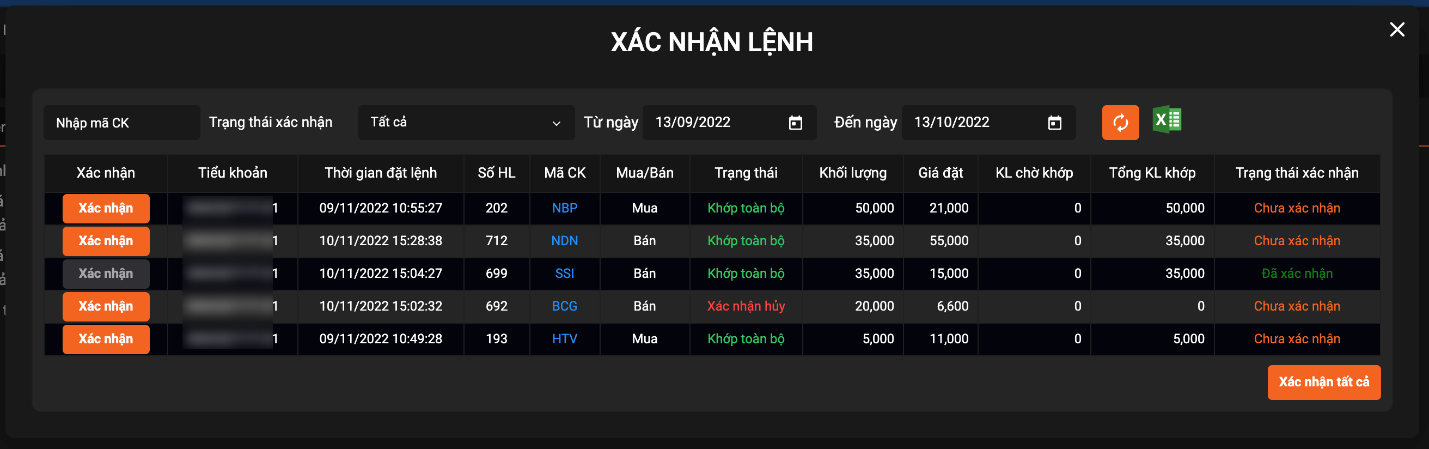 - Khi nhấn chọn “Xác nhận tất cả” hệ thống sẽ mở lên màn hình xác nhận lệnh theo khoảng thời gian đang tra cứu.
