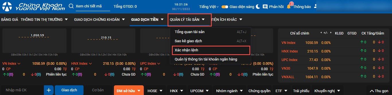 - Để truy cập màn hình “Xác nhận lệnh”, quý khách thao tác các bước như mở màn hình “Tổng quan tài sản” và nhấn chọn mục “Xác nhận lệnh”