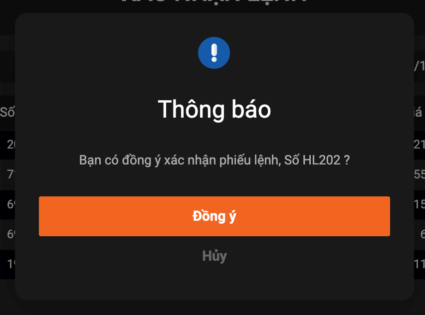 - Sau khi nhấn chọn xác nhận hệ thống sẽ mở lên màn hình thông báo xác nhận lệnh với SHL cụ thể