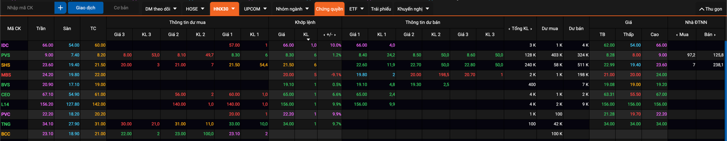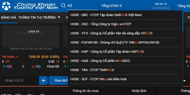 - Để mở màn hình thông tin chi tiết mã chứng khoán, quý khách nhấn chọn vào tên mã chứng khoán trên bảng giá trực tuyến hoặc bất kì màn hình nào có thể nhấp chọn vào tên mã chứng khoán.