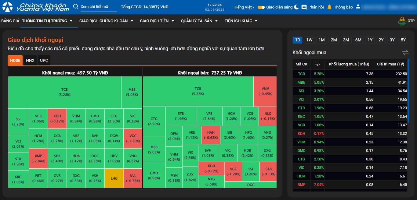 - Hệ thống sẽ chuyển đến màn hình “Giao dịch khối ngoại”