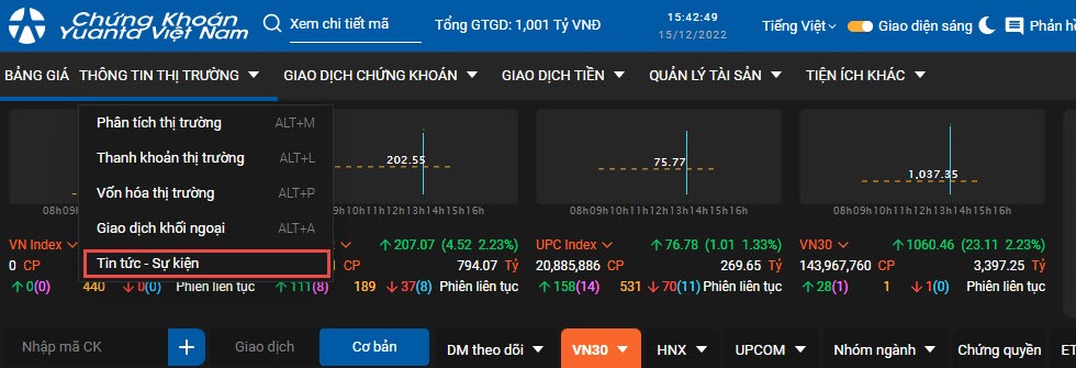 - Để vào màn hình “Tin tức – sự kiện” người dùng cần rê chuột vào mục “Phân tích thị trường” trên menu chính và chọn “Tin tức – sự kiện”