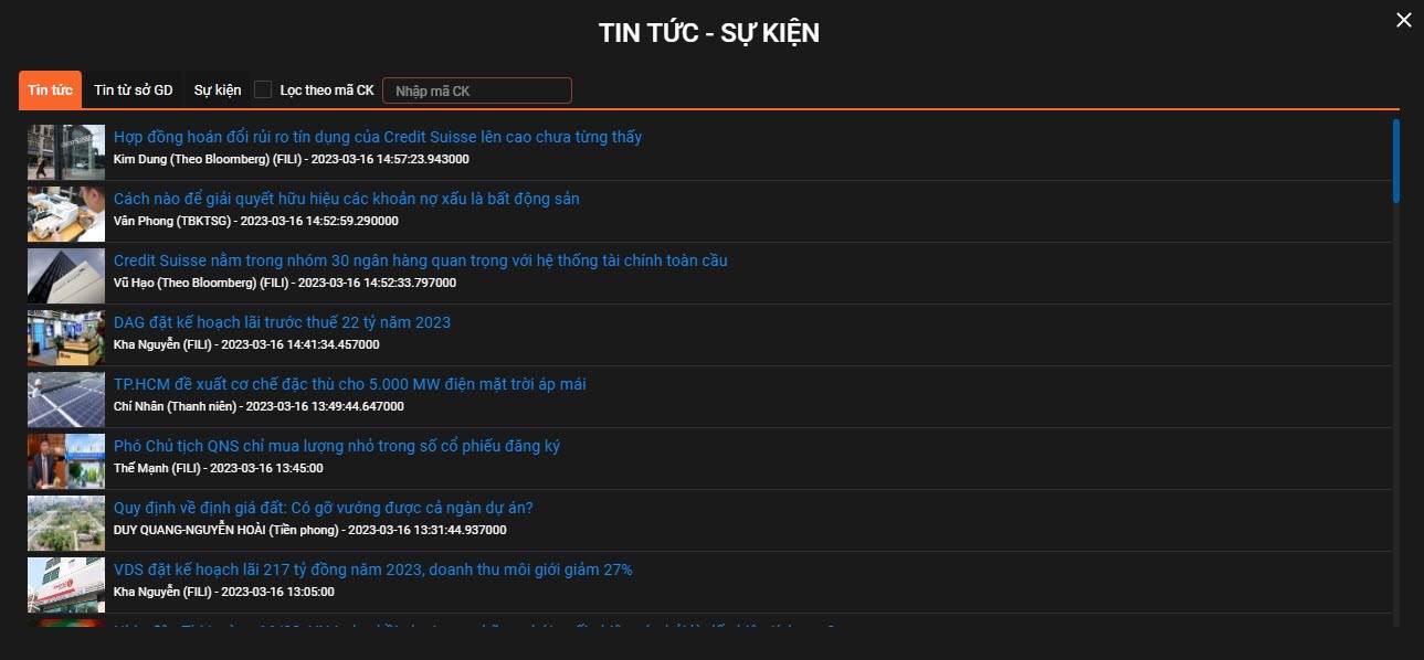 - Hệ thống sẽ chuyển đến màn hình “Tin tức – sự kiện”. Tại đây, quý khách có thể tra cứu tin tức, sự kiện mới nhất liên quan đến mã cổ phiếu.