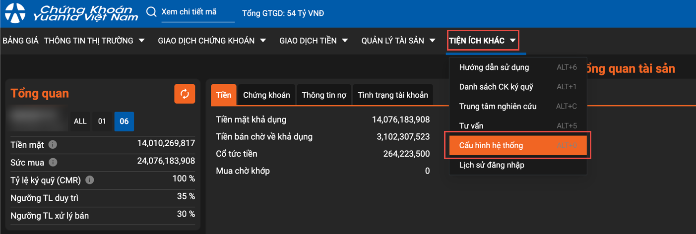 - Để truy cập màn hình “Cấu hình hệ thống” quý khách cần rê chuột vào mục “Tiện ích khác” trên menu chính và chọn “Cấu hình hệ thống”