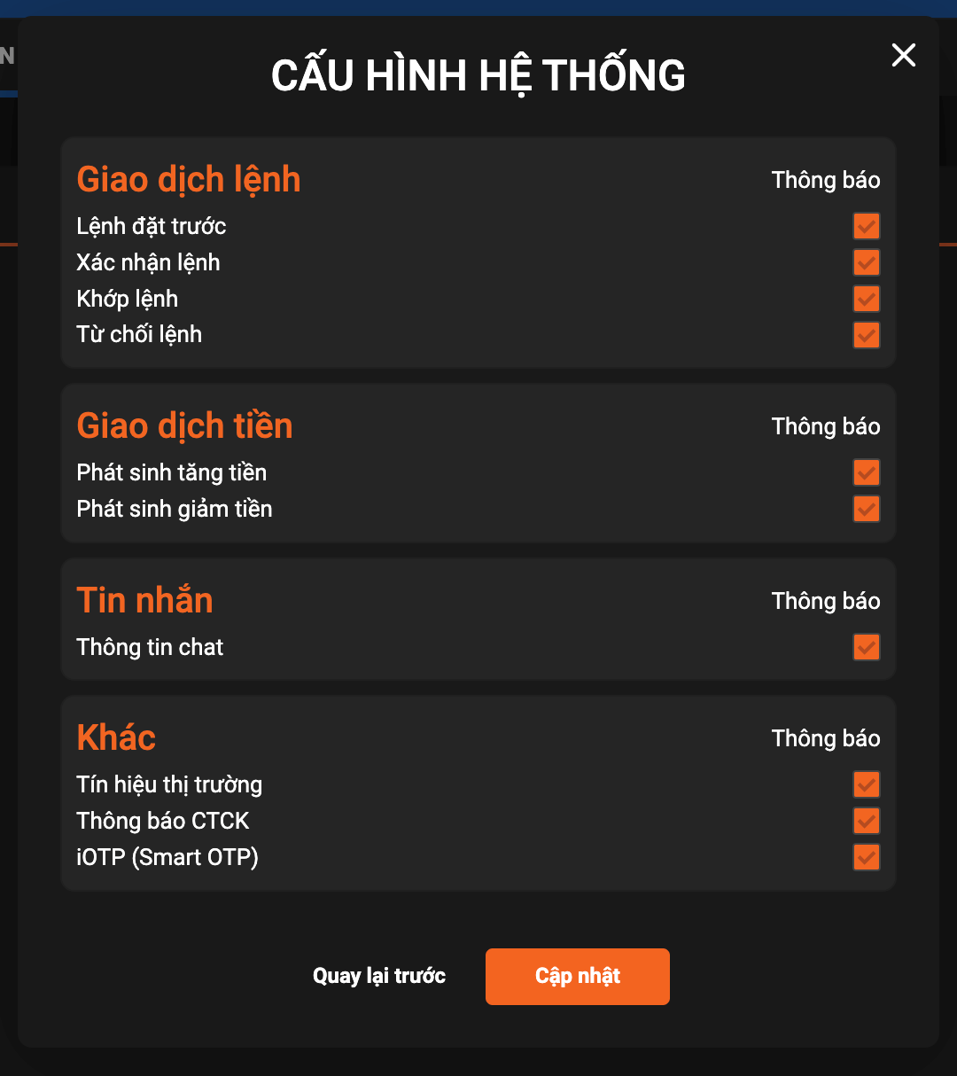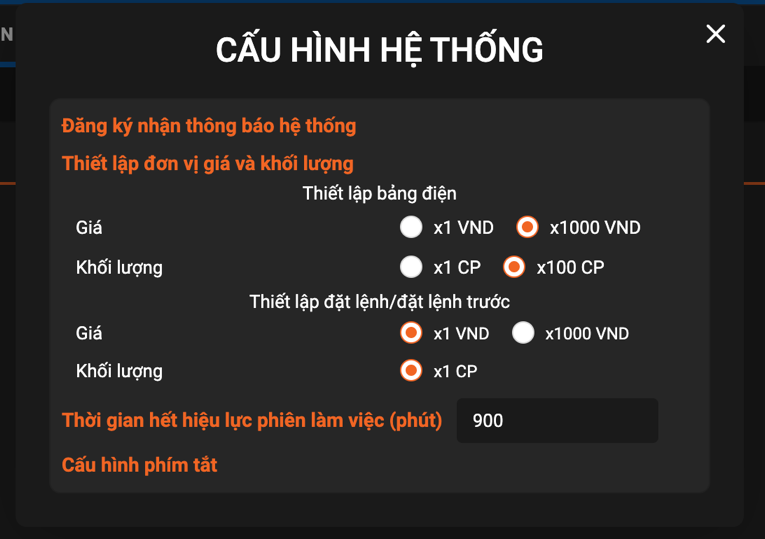 - Tương tự với màn hình Cấu hình phím tắt khách hàng có thể chọn vào “Đăng ký nhận thông báo hệ thống” để cấu hình nhận các thông báo liên quan đến hệ thống