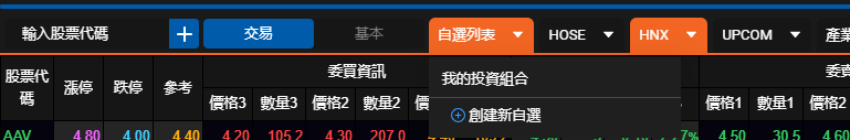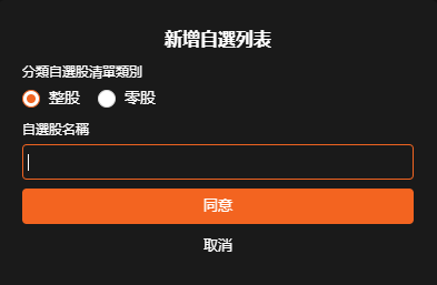 - 若要創建新自選,只需將滑鼠停在「自選列表」框上,然後點擊「創建新自選」將開啟一個新視窗,您可以在其中輸入自選股名稱。