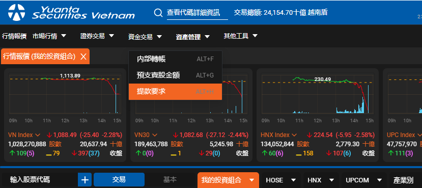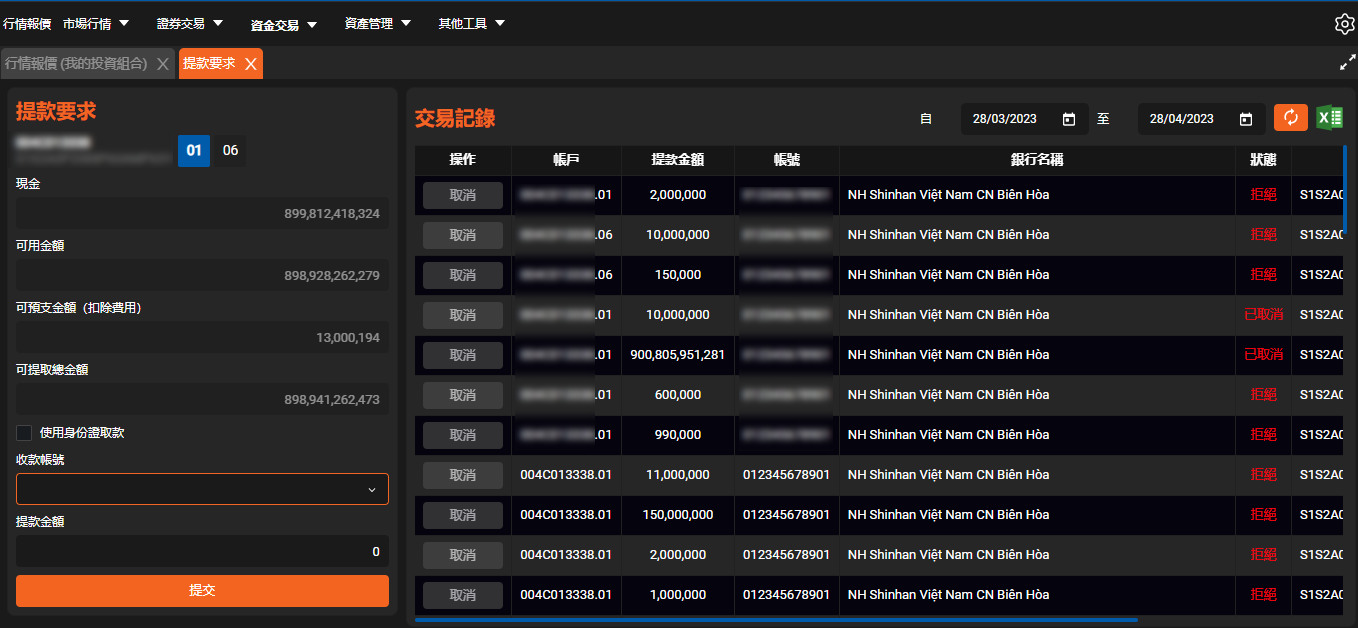 - 若想進入「提款要求」畫面,請將滑鼠停在主選單上的「資金交易」,然後點擊「提款要求」。