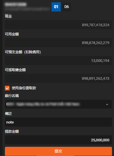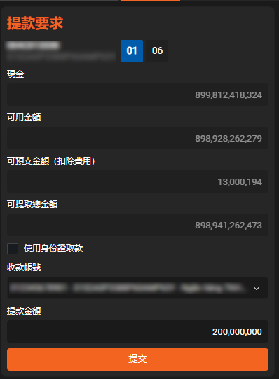 - 與提款至連結銀行帳戶的請求類似,想以身分證提款時,請勾選「以身分證提款」,並輸入所有收款資訊、收款銀行,提款金額並按下「提交」按鈕。
