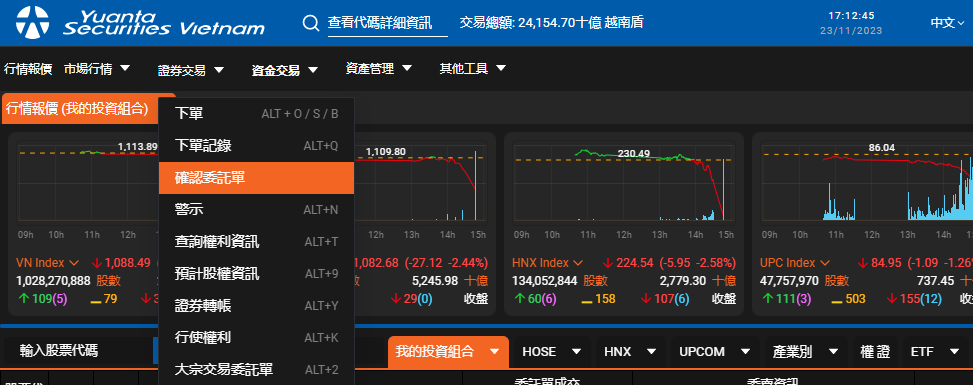 - 若想進入「交易明細」畫面,請將滑鼠停在主選單上的「資產管理」,然後點擊「確認委託單」。