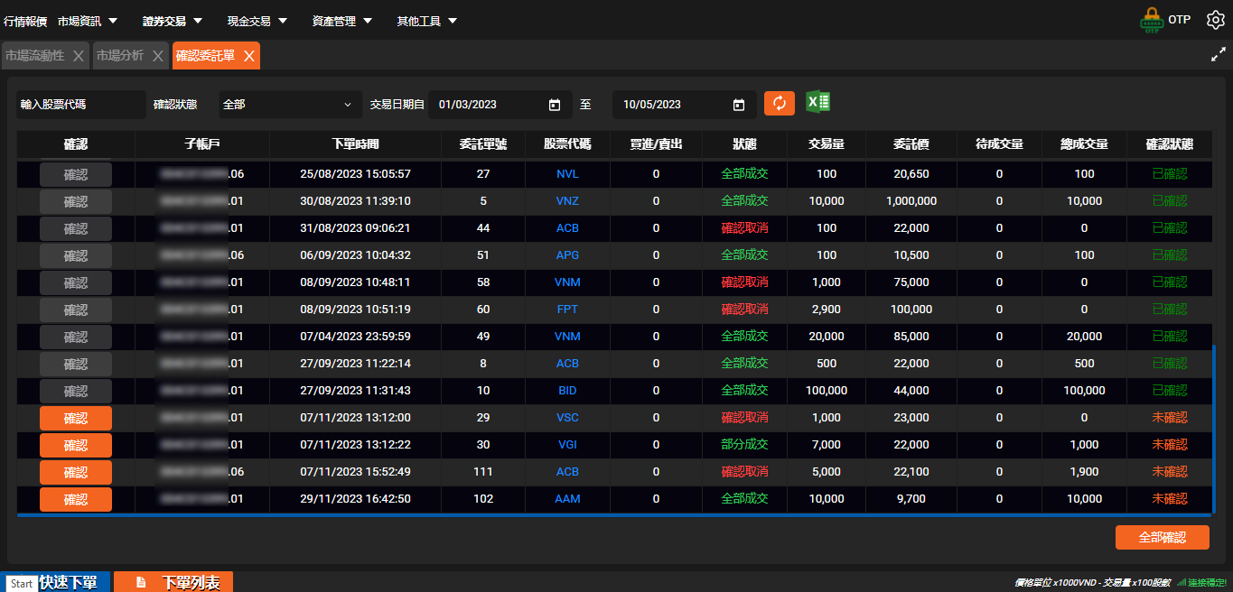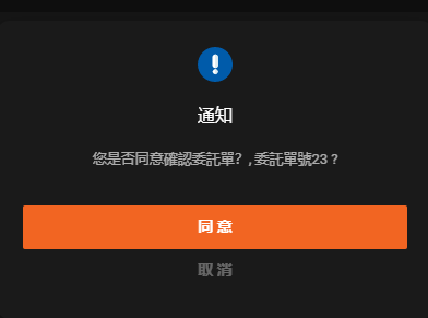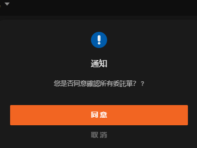 - 在這裡您可以確認每筆委託單或確認所有委託單,只需點擊待確認委託單處的「確認」按鈕,或點擊下方的「全部確認」。