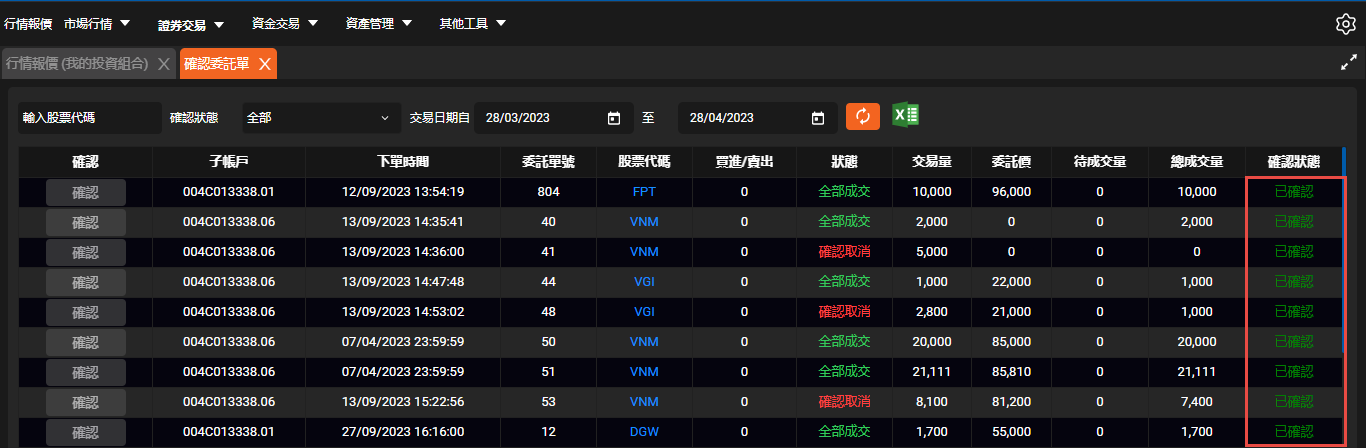 - 點選確認後,系統將打開確認委託單資訊的畫面。